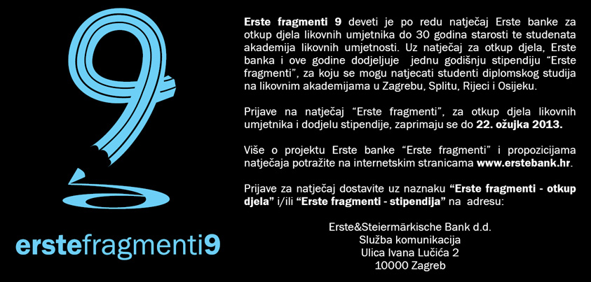 Erste fragmenti 9 deveti je po redu natječaj Erste banke za otkup djela likovnih umjetnika do 30 godina starosti te studenata akademija likovnih umjetnosti. Uz natječaj za otkup djela, Erste banka i ove godine dodjeljuje jednu godišnju stipendiju “Erste fragmenti”, za koju se mogu natjecati studenti diplomskog studija na likovnim akademijama u Zagrebu, Splitu, Rijeci i Osijeku.