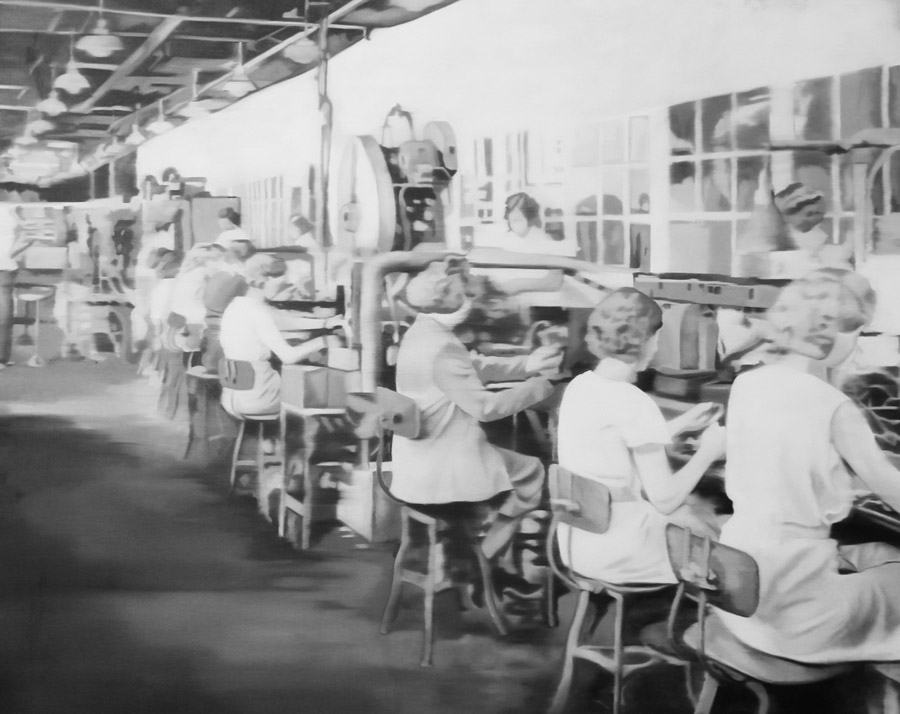 Osoba radnika koja je u socijalističkoj, ali i kapitalističkoj mitologiji imala ulogu oslonca društva, danas je posve marginalizirana. Hardt i Negri u Imperiju primjećuju da uz stvaranje novih globalnih tijekova kapitalističke proizvodnje vrijednosti: „glavni procesi proizvodnje se i sami transformiraju, što rezultira time da je uloga industrijskog tvorničkog rada smanjena i prioritet je dan komunikativnom, kooperativnom i afektivnom radu“. Čini se da tvornice zaista žive samo u sjećanju i na starim fotografijama. Spoj te dvije komponente prošao je kroz Martinu Grlić i urodio ovim ciklusom slika ljudi na radu u interijerima postrojenja hrvatskih tvornica: Koka, Podravka, Jadran, Jugoplastika i druge. …