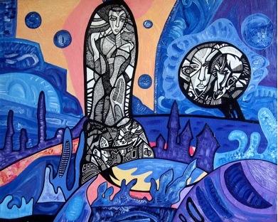 To je transcedentalan svijet, izvanprostorni i izvanvremenski okvir bez zakona gravitacije. Svemirski pejsaž planetarnih, zvjezdanih i lunarnih objekata nastanjen likovima Zemljana i izvanzemaljaca. To je bestežinski ples nagih figura s licima rastočenim apstraktnim plohama geometrijskih vezova. Izvanzemaljske likove čini digitalna generacija kompjutorskih umova koja nije lišena osjećajnosti. Njihova antropomorfna pojava ružičastih udova i velikih glava komunicira pokretima, gestama i mimikom. Animalni hibridi i digitalni humanoidi nastanjuju nepregledna polja svemira, Mliječne staze, Velikih i Malih kola, Velikog medvjeda i drugih svemirskih putanja od postanka do vječnosti.
