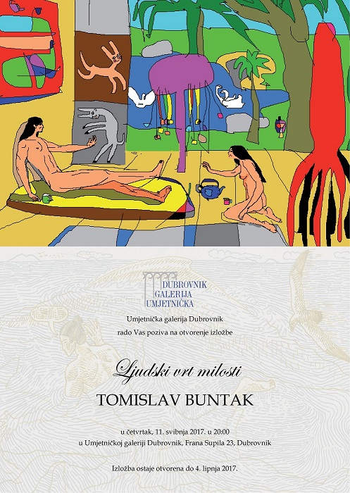 Izložba Tomislava Buntaka, renomiranog hrvatskog umjetnika mlađe generacije naziva „Ljudski vrt milosti“ bit će otvorena u Umjetničkoj galeriji Dubrovnik u četvrtak, 11. svibnja u 20:00 sati.