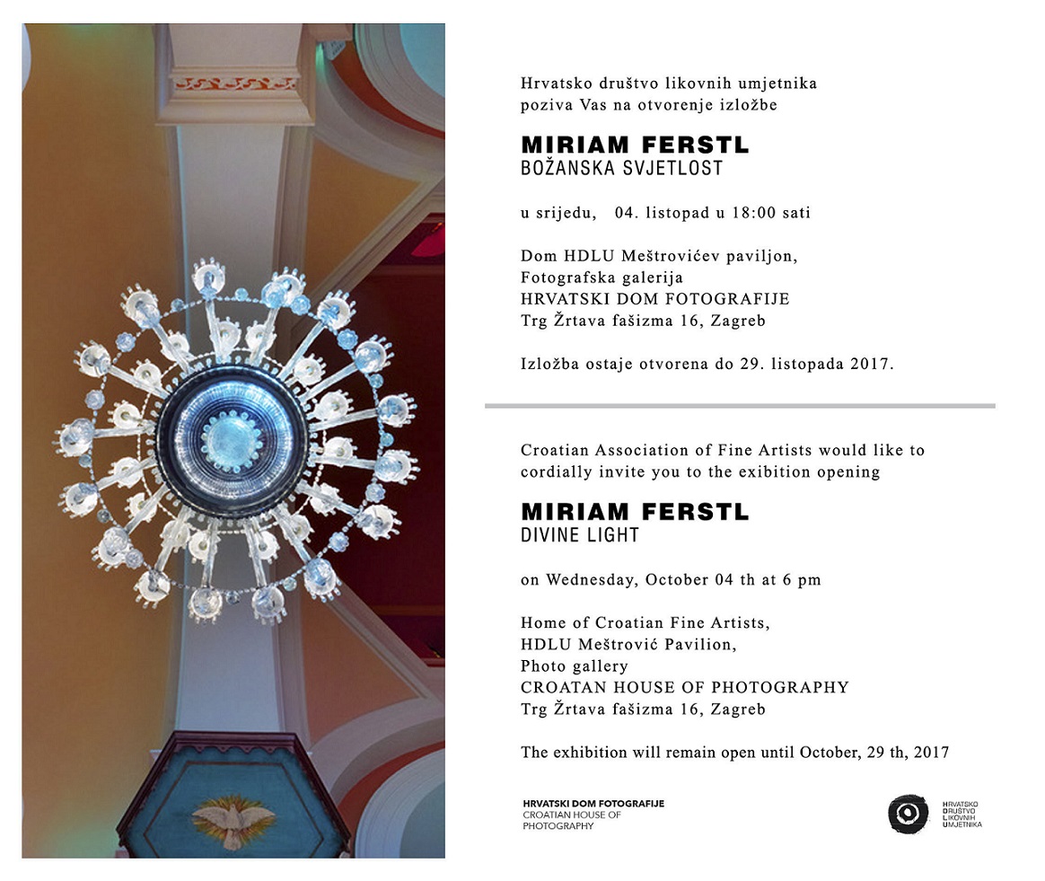 Mlada njemačka fotografkinja Miriam Ferstl izložbom fotografija Božanska svjetlost po prvi se put predstavlja zagrebačkoj publici. Ciklus je rezultat njezinog prošlogodišnjeg terenskog rada na otocima Braču, Korčuli, Visu i Hvaru, u čijem su fokusu crkveni lusteri i svijećnjaci, fotografirani iz žablje perspektive. Na ovaj način Ferstl želi navesti promatrača na gledanje svakodnevnih detalja, često zanemarenih i neprimjetnih predmeta iz crkvenog inventara na posve drugačiji način, ne samo dubljim pogledom na površinu predmeta, već i promatranjem duhovnim očima. Crkveni svijećnjaci u Ferstlinom objektivu nisu samo bogato ukrašeni i raskošno obojeni predmeti. Oni su i prijenosnici drevnih, arhaičnih vibracija molitvi, pjesama i otočkih melodija, odjeci lokalnih priča i sjećanja. Na simboličan način prikazuju nebo i zemlju, božansko i ljudsko, vječno i raspadljivo. Nijedan svijećnjak nije jednak, no svaki je jednako savršen u vlastitoj geometrijskoj pravilnosti, simetriji, ljepoti i energiji. Skladnost običnih metalnih i staklenih predmeta na fotografijama održava duhovno središte svih stvari, poziva nas da se ohrabrimo zaroniti ispod površnosti ovog svijeta i pronađemo svjetlost koja je u nama i oko nas.