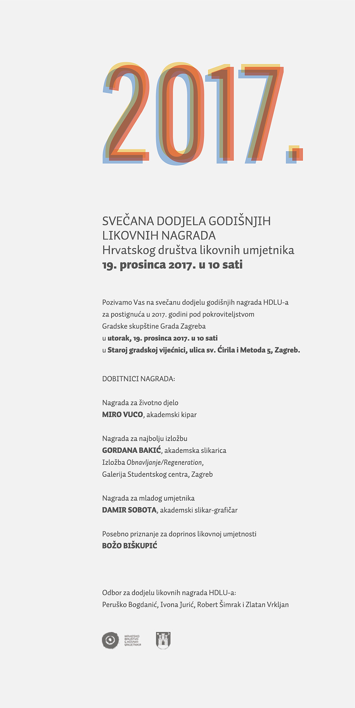 Odbor za dodjelu likovnih nagrada HDLU-a u sastavu Peruško Bogdanić, Ivona Jurić, Robert Šimrak i Zlatan Vrkljan dodjelio je Godišnje nagrade HDLU-a za 2017. godinu: