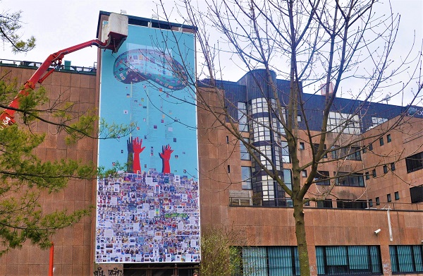 Prikaz rada Maje Bachler na plakatu na pročelju zgrade tvrtke CROZ, 12 x 4.80 m