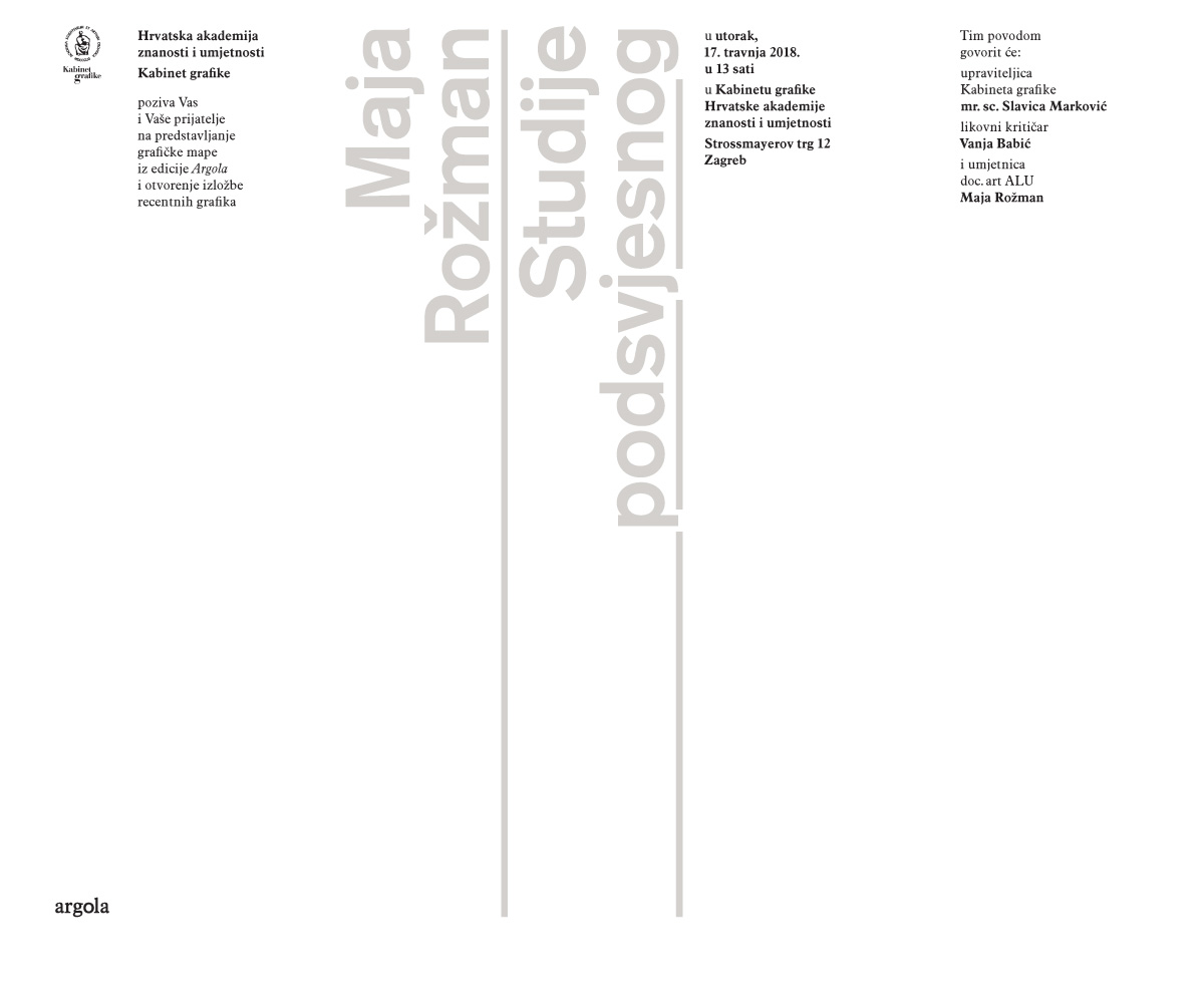 Pozivamo Vas na predstavljanje grafičke mape iz edicije ARGOLA – Maja Rožman / Studije podsvjesnog i otvorenje izložbe recentnih grafika u utorak, 17. travnja s početkom u 13 sati u Kabinetu grafike Hrvatske akademije znanosti i umjetnosti na Strossmayerovom trgu 12 u Zagrebu.