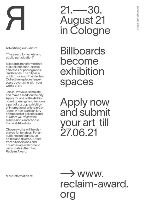 Od 21. do 30. kolovoza, treći put u Kölnu (Njemačka) pod moto „Advertising out – Art in!“ održava se međunarodan izložba skupna izložba. Trenutno je za navedenu izložbu otvoreni poziv za prijavu umjetnika koji žele sudjelovati i tako postanite izložbe koju će činiti 44 reklamnih panoa diljem u Kölna. Izložba se održava u sklopu projekta “Reclaim Award”.