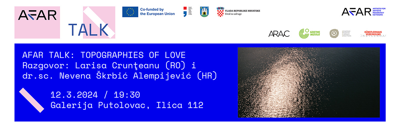 Donosimo vam fotografije s jučerašnjeg razgovora Larise Crunţeanu (RO) i dr.sc. Nevene Škrbić Alempijević (HR): AFAR talk – Topographies of Love, kao dio europskog projekta ??????? ??? ??????? ????????? ??????? (????), koji ima za cilj poboljšati mobilnost suvremenih vizualnih umjetnika_ica i kustosa_ica, stvarajući pritom veće mogućnosti za žene u umjetnosti, a odvija se u četiri europske partnerske zemlje – Rumunjskoj, Njemačkoj, Hrvatskoj i Austriji. Razgovor se održao u suradnji s diskurzivnim programom doktorskog studija Akademije […]