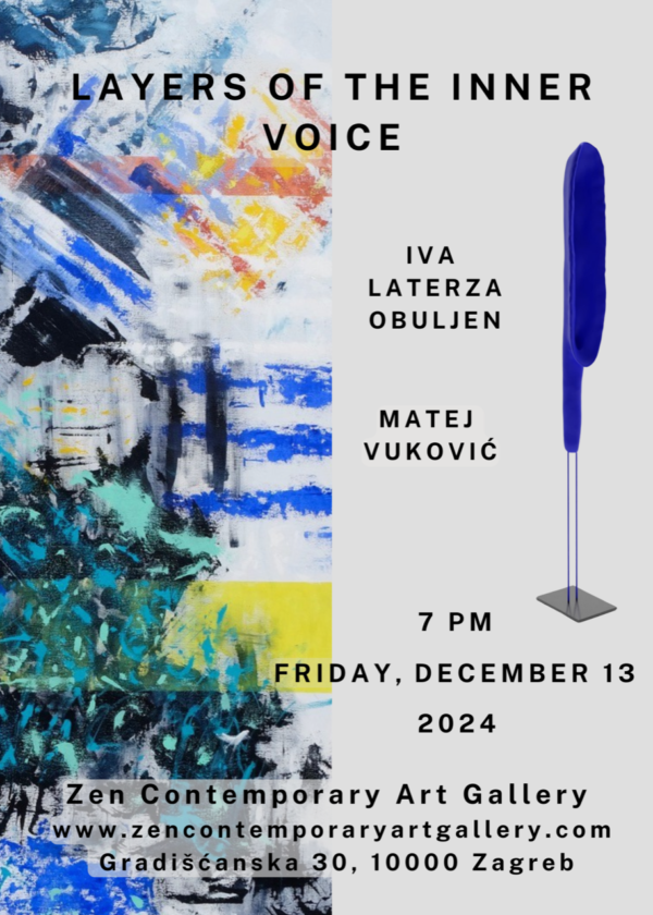 U petak, 13. prosinca s početkom u 19 sati u Zen Contemporary Art galeriji otvara se izložba Slojevi unutarnjeg glasa, koja okuplja radove dubrovačke slikarice Ive Laterze Obuljen i zagrebačkog kipara Mateja Vukovića.