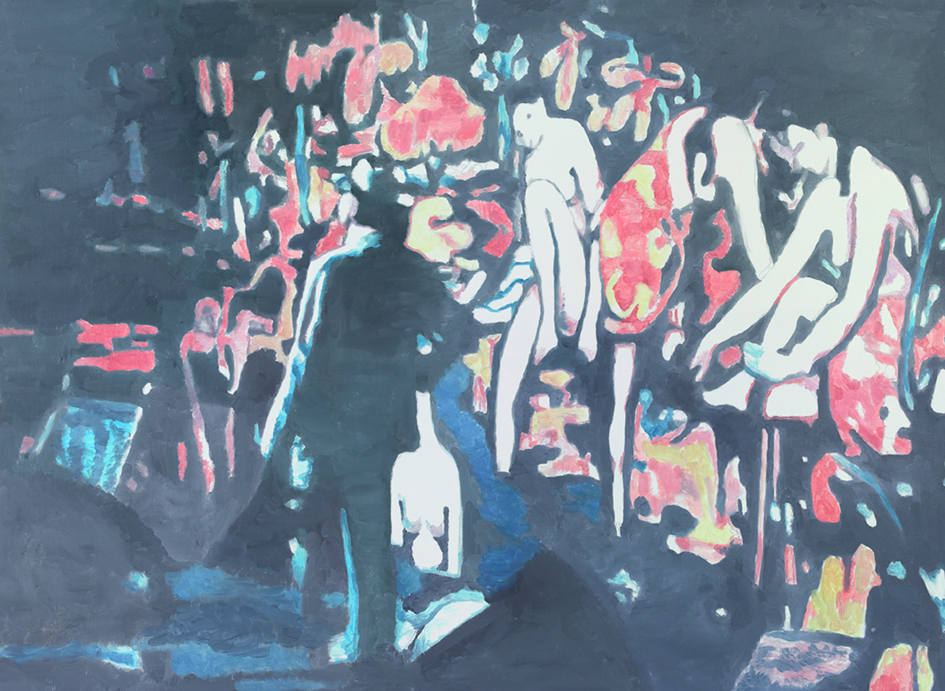 Tuymans’s new series of paintings is inspired by the final scenes of the 1942 black-and-white film The Moon and Sixpence, which was adapted from the 1919 novel by W. Somerset Maugham. The film tells the story of Charles Strickland, played by the British actor George Sanders, a middle-aged stockbroker who abandons his middle class life, his family, and duties, to start painting. Loosely based upon the life of Paul Gauguin, the movie ends weeks after the death of Strickland, when his doctor travels from London to the village in Tahiti where the main character lived. When the doctor enters the painter’s cabin, the movie changes from black-and-white to Technicolor. Tuymans made a series of screenshots of this color metamorphosis. The photographer’s reflection-that of Tuymans himself-can be seen in the screenshots and therefore also in the paintings.