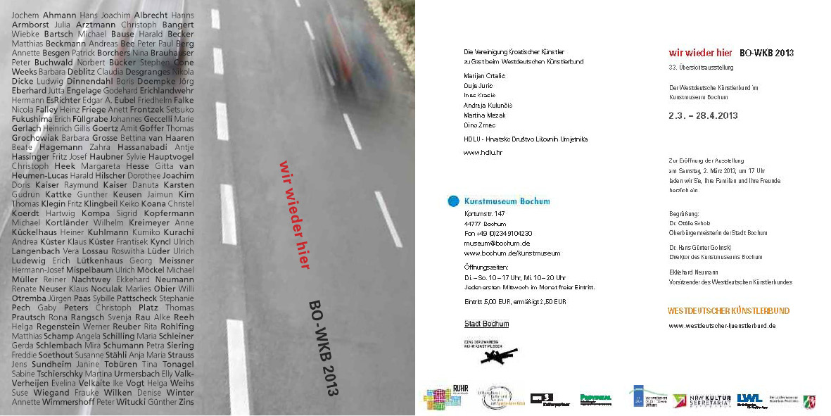 The exhibition named wir wieder hier is going to be held in Kunstmuseum in Bochum, Germany from March 2nd until April 28th 2013 and along with the artworks of German artists there are going to be presented artworks of six Croatian artists: Marijan Crtalić, Duje Jurić, Ines Krasić, Andreja Kulunčić, Martina Mezak and Dino Zrnec.