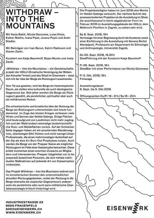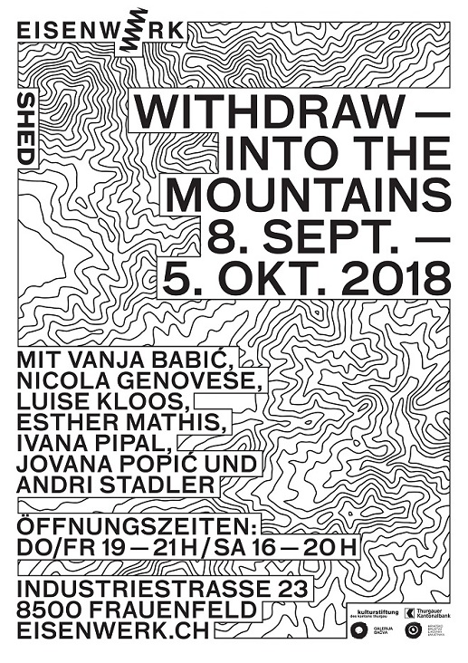 Obavještavamo vas kako će se 8. rujna u 19.00h u Galeriji Shed Esenwerk otvoriti izložba WITHDRAW INTO THE MOUNTAINS (U PLANINAMA), kustosa Bojana Mucka, Josipa Zankija i Katje Baumhoff. Na izložbi će sudjelovati Vanja Babić, Nicola Genovese, Luise Kloos, Esther Mathis, Ivana Pipal, Jovana Popić i Andri Stadler.